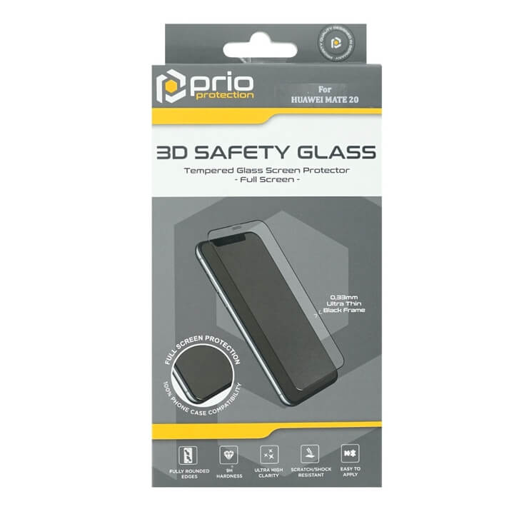 Prio 3D Glass Full Screen Tempered Glass Screen Protector - калено стъклено защитно покритие с извити ръбове за целия дисплей на Huawei Mate 20 (черен-прозрачен)