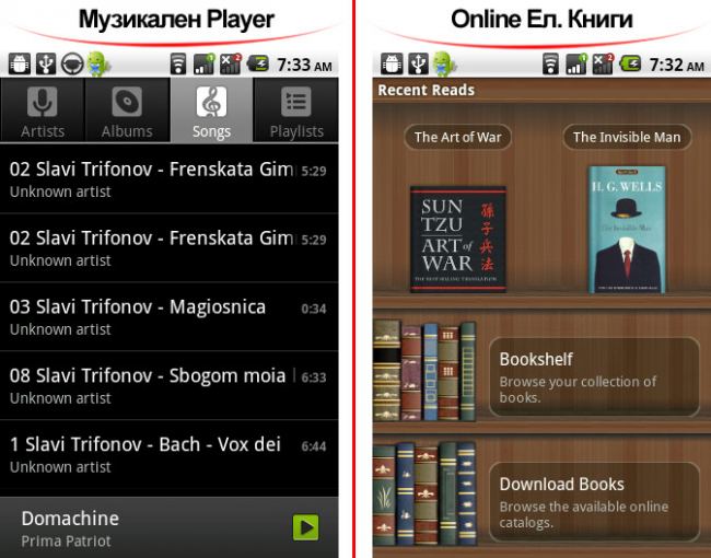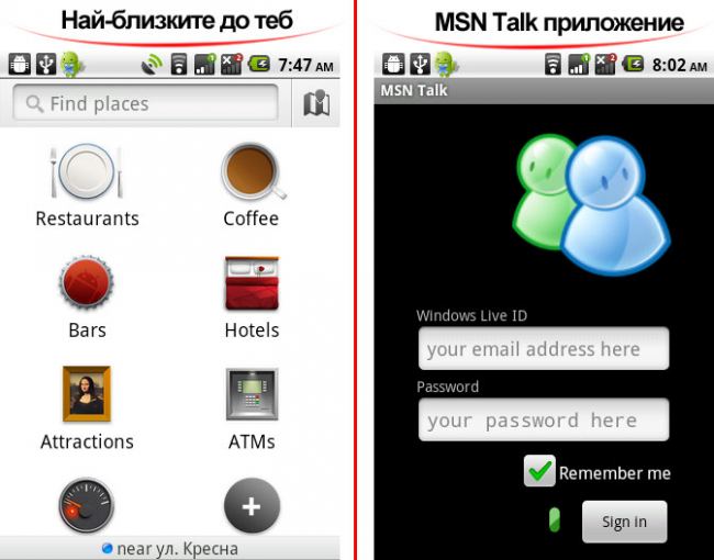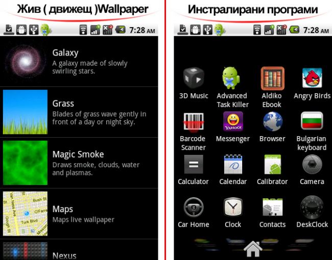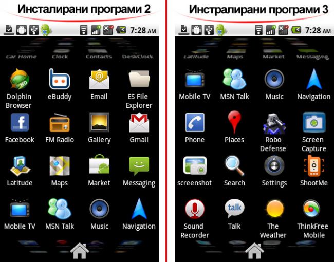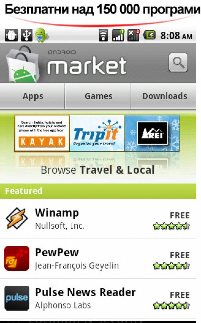 150 000 хиляди безплатни приложения и игри, които можете да свалите безплатно от Android Market и инсталирате Skype, Goolge maps, Facebook, Goolge mail, навигационни програми ,Office пакет - Word , Exell , PowePoint, Winamp, Видео плаъри с субтитри, Youtube, Opera, Firefox browser, Антирадар, торент програми и още безброи много популярни приложения които няма да стигне страницата за да опишем.