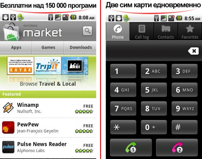 Това значи че имате напълно функционален телефон на който може безплатно да си изберете и свалите над 250 000 програми и игри за този телефон. Но предимството тук е че освен, че това е перфектен смартфон, той работи с две сим карти едновременно с което неможе да се похвали никои от най-класните телефони с цена над 1000лв.