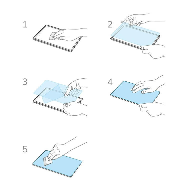 1. Изчистете дисплея с кърпичката в комплекта или друга микрофибърна кърпичка 2. Отлепете фолиото (залепено върху стъкления протектор) 3. Подравнете и приложете стъкления протектор върху устройството 4. Ако има останали балончета с въздух, избутайте ги навън с кърпичка, гума или кредитна карта.