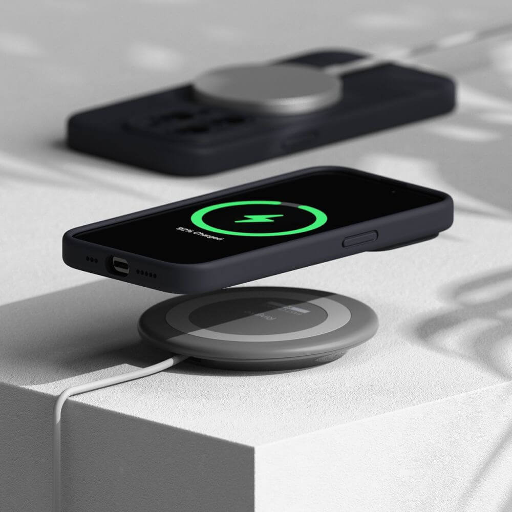 - • Кейсът е снабден с магнит, благодарение на който е съвместим с MagSafe аксесоари. Това е изцяло нов стандарт на Apple за бързо и лесно свързване на аксесоари и безжични зарядни устройства