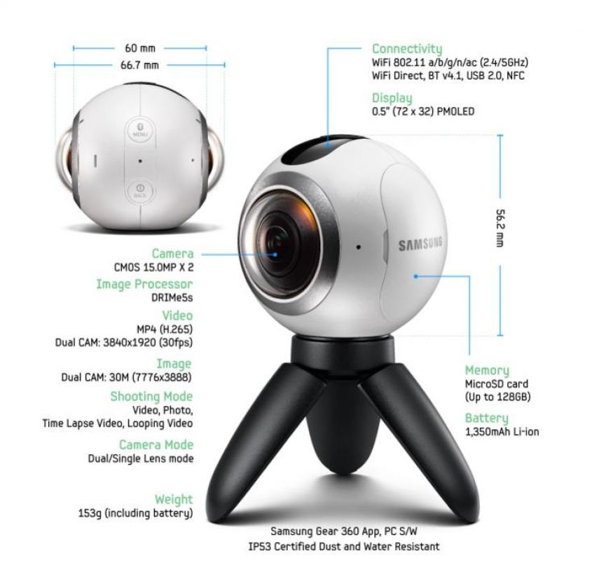 - Samsung Gear 360 е 360-градусова камера, която позволява на потребителите лесно да създават, да преглеждат и споделят любимите си преживявания. Gear 360 е предназначена за пътувания, фестивални събирания и всякви дейности, за да ви осигури всеобхватно визуално преживяване. Новата камера постига най-доброто от опита на Samsung Galaxy, така че потребителите могат да създават своя собствена виртуална реалност и да се наслаждават през Gear VR очилата