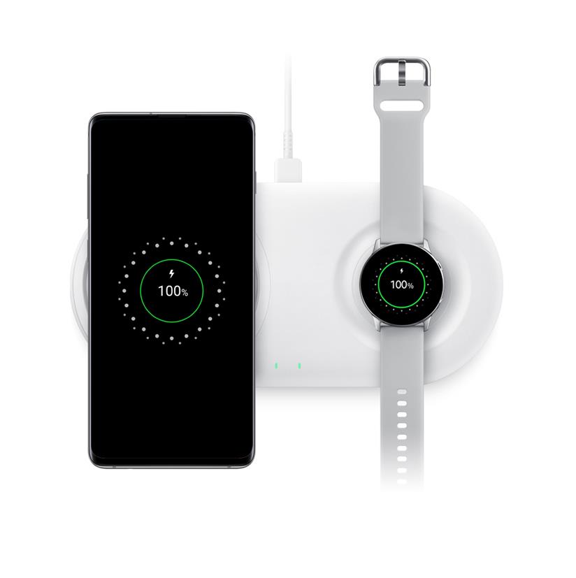 - Заредете смартфон и Galaxy Buds или Smartwatch - Двойното безжичното зарядно може да зарежда също и вашият Samsung Smartwatch. Gear S3, Gear Sport и Galaxy Watch могат да се зареждат на същото място, точно като телефона ви, като просто поставят часовника си на зареждащата поставка