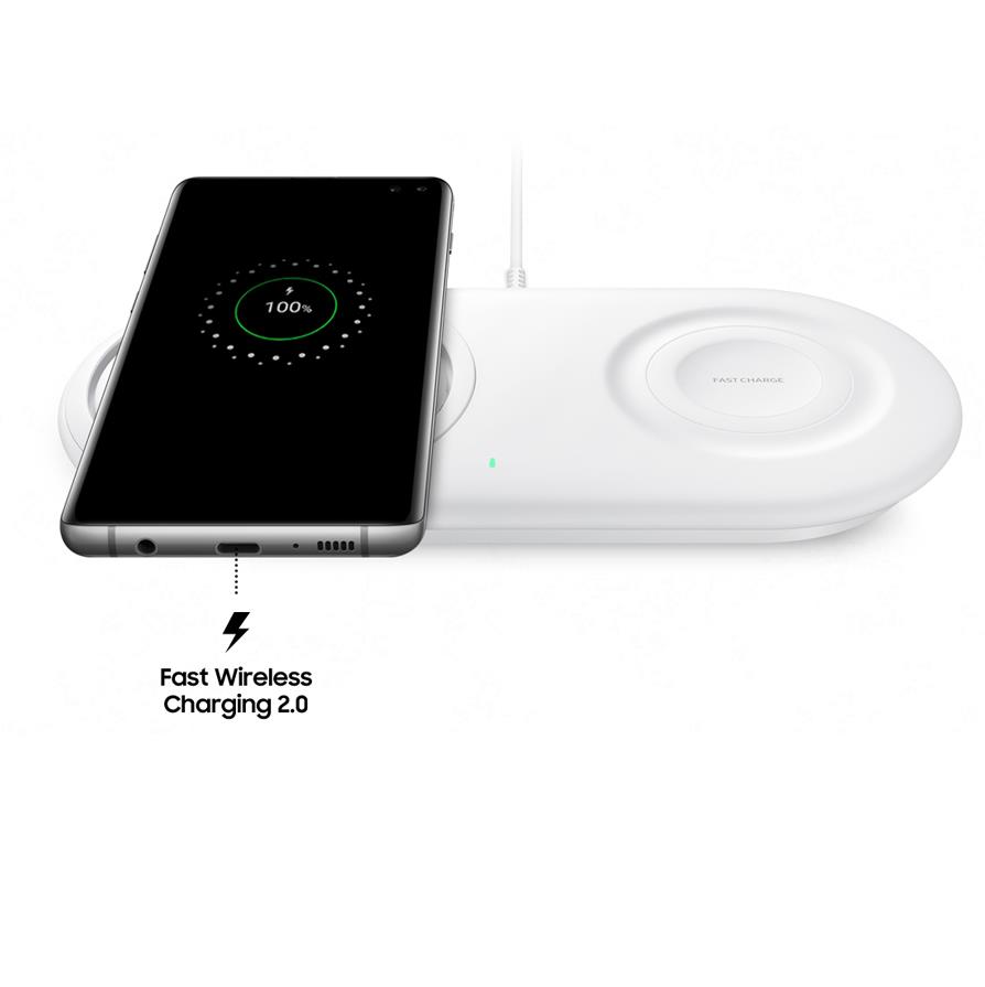 - Внимание: лявата страна на пада е с технология Fast Charge 2.0, а дясната е с Fast Charge. Когато зареждате две устройства едновременно (без Galaxy Watch) не може да използватеFast Charge 2.0