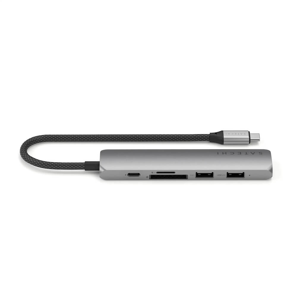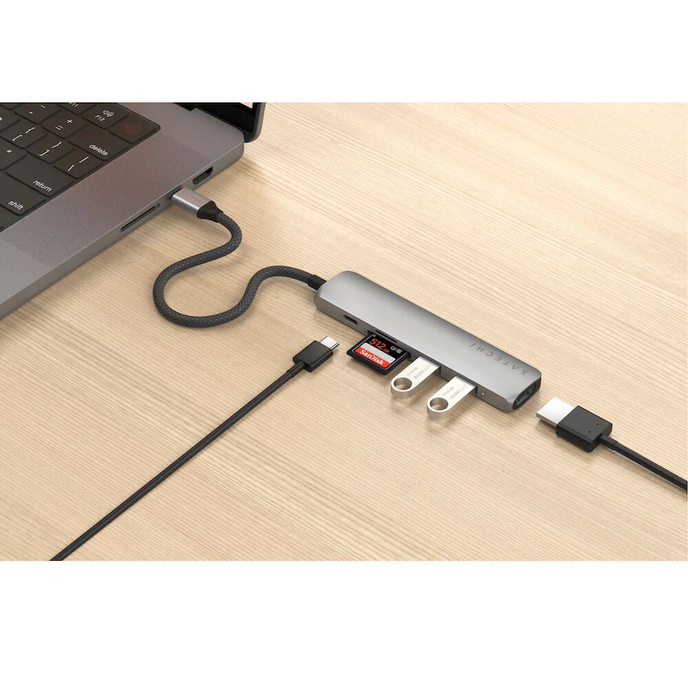 Satechi 6-in-1 USB-C Aluminum Slim Multiport Adapter - мултифункционален хъб за свързване на допълнителна периферия за компютри с USB-C (тъмносив)