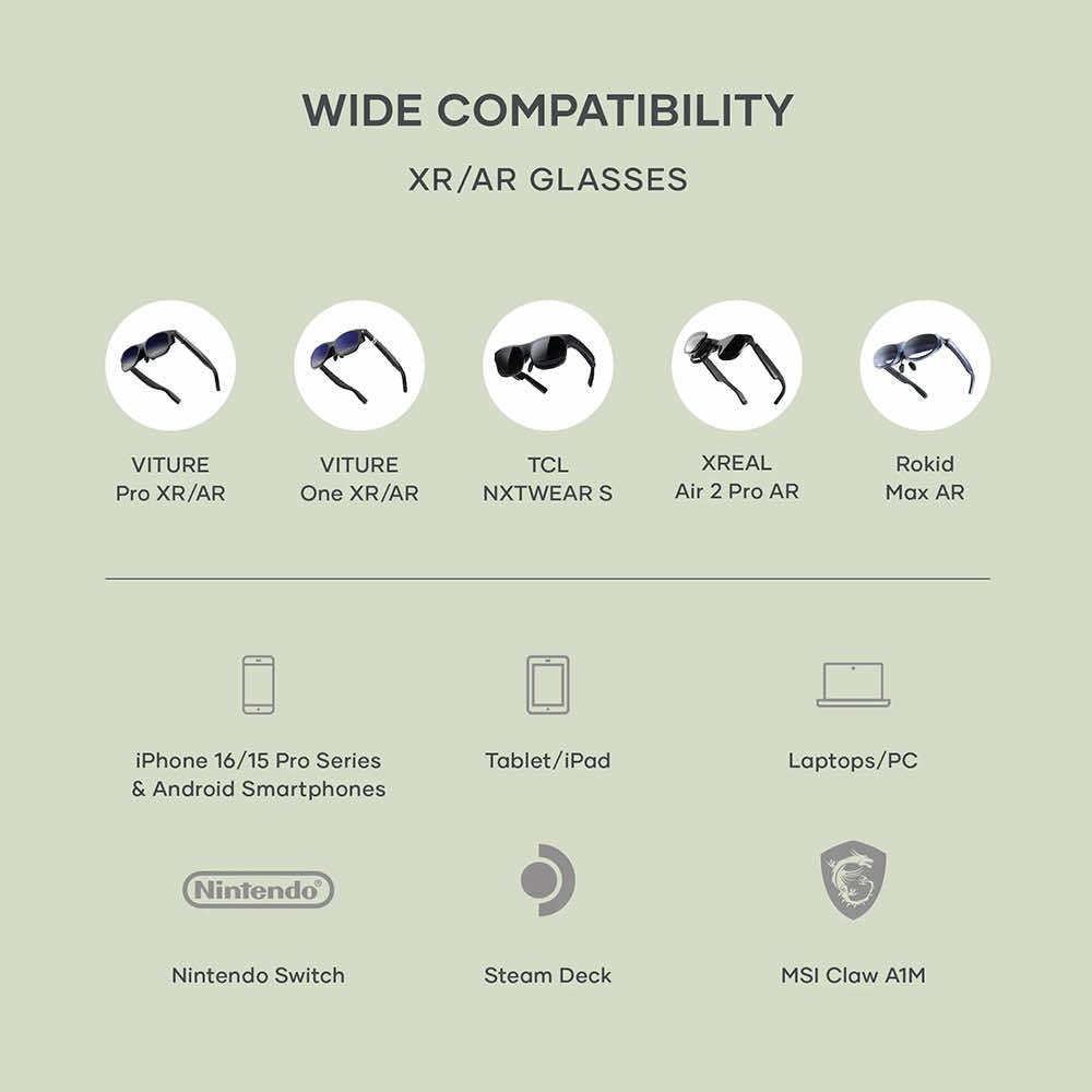 - Зареждане на устройства: Поддържайте зареждането на вашите устройства с до 27W за iPhone, 45W за Nintendo Switch и 100W за лаптопи, за да се потопите напълно в XR изживяването, без притеснения за изтощена батерия.