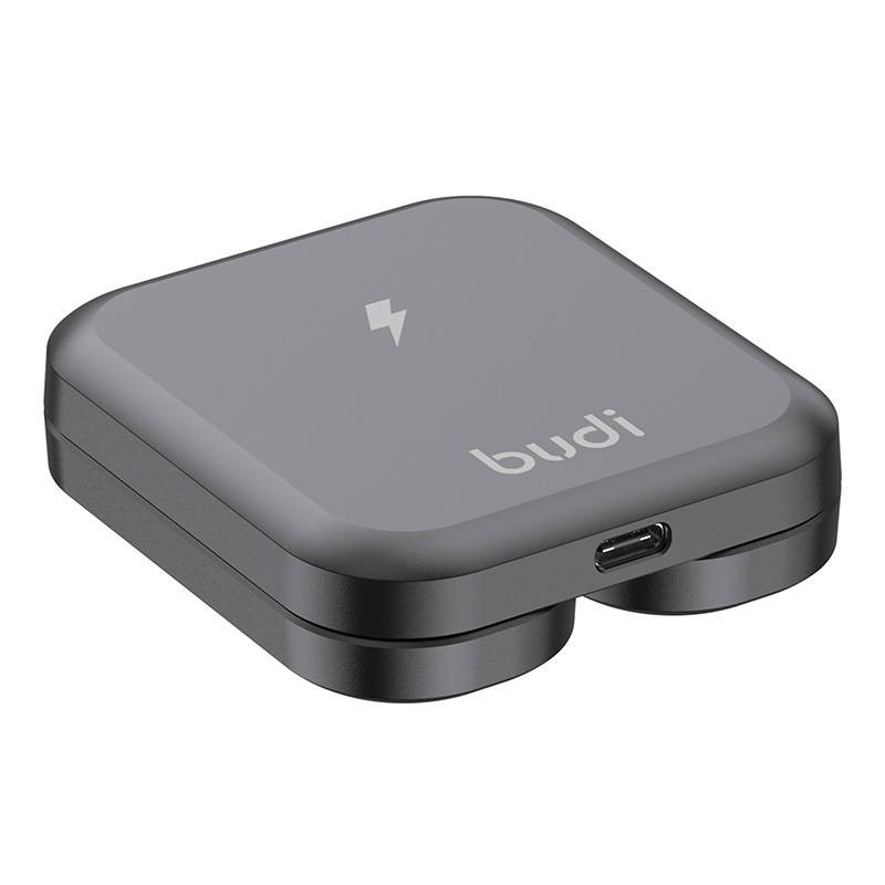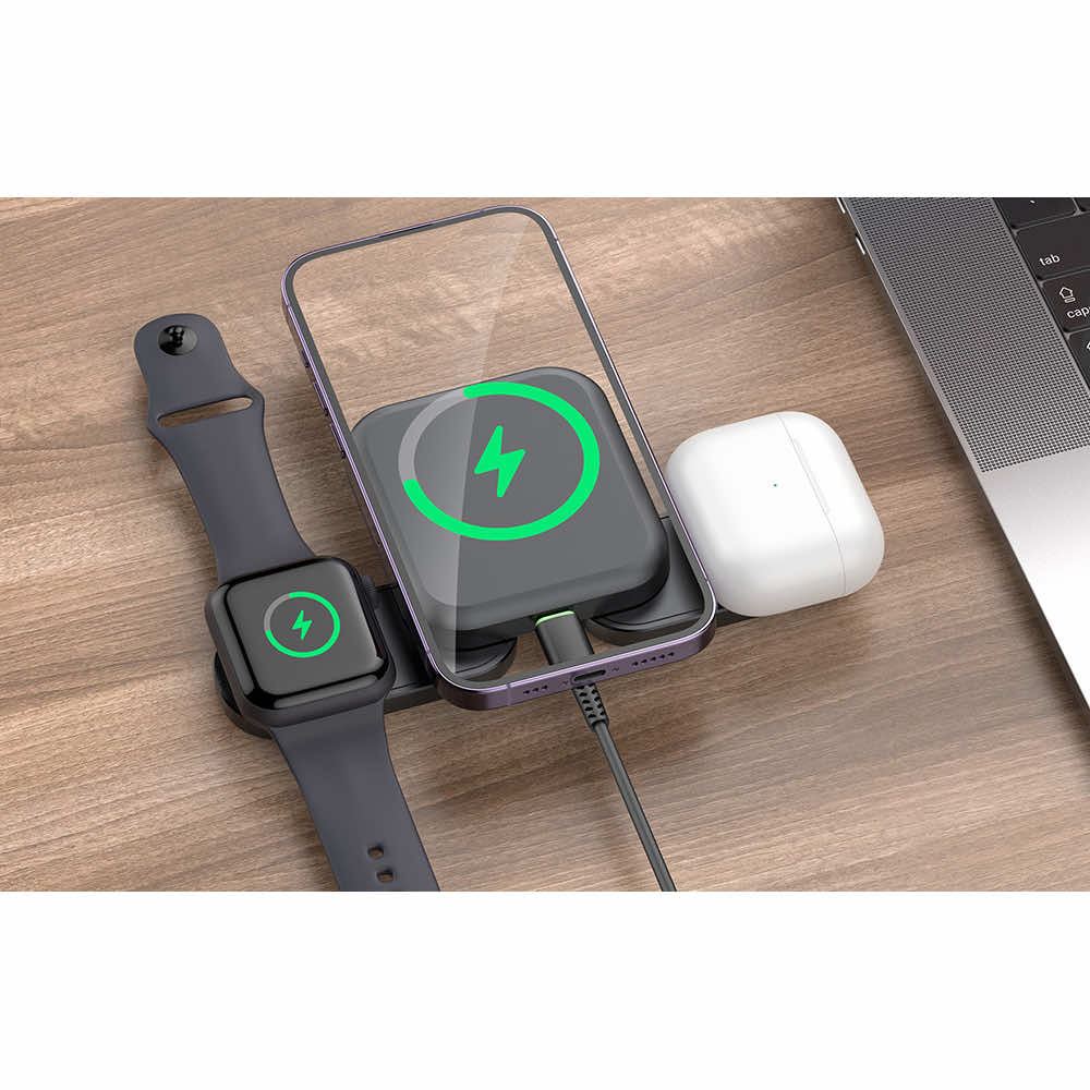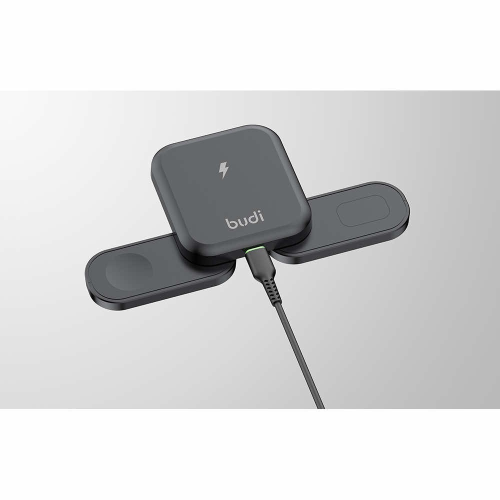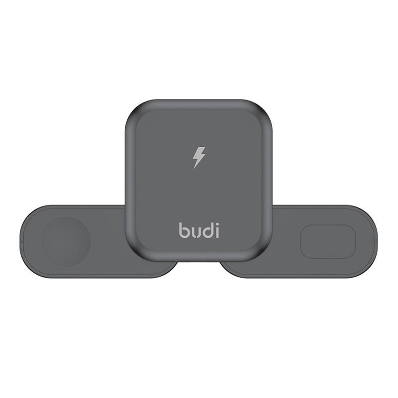 Сгъваема тройна поставка (пад) за безжично зареждане за iPhone, Apple Watch, AirPods и Qi съвместими мобилни устройства - Budi 3-in-1 Wireless Charger 15W (черен)