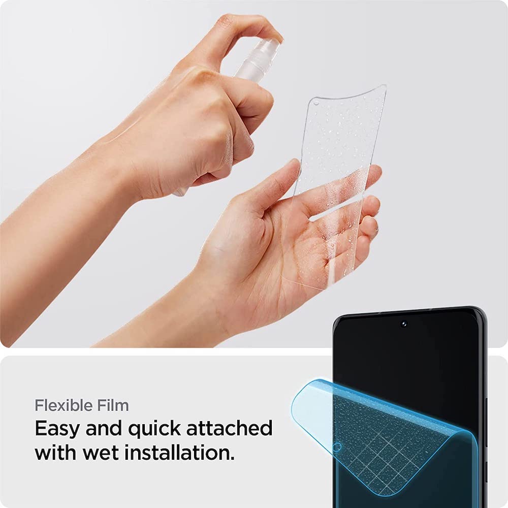 В комплекта получавате 2 x Spigen Neo Flex Screen Protector и 1 x комплект за поставяне. Обърнете внимание, че протекторът се поставя чрез "мокро поставяне", което може да доведе до балончета в първите 12-13 часа, но след изсъхването на спрея, покритието ще се залепи от самосебе си. За най-добри резултати, поставяйте протектора в безпрашна среда.