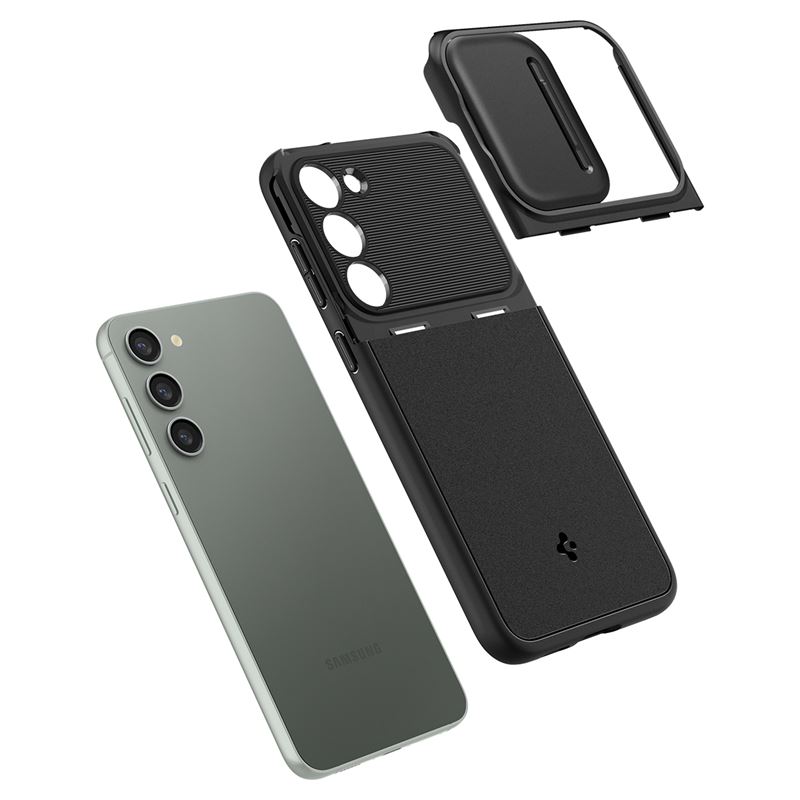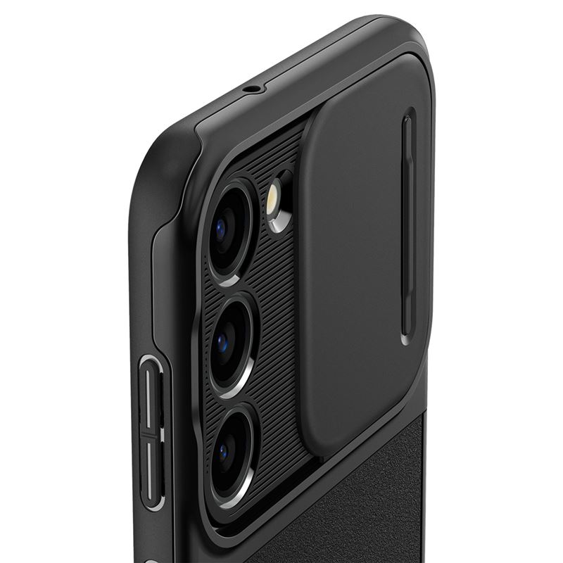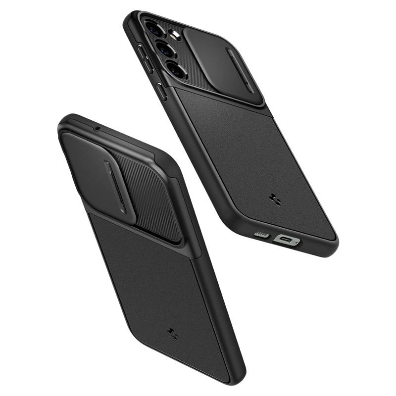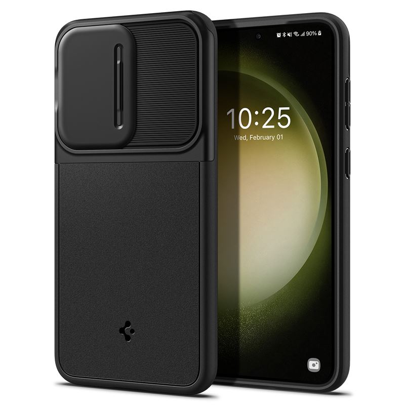 Spigen Optik Armor Case - тънък качествен силиконов (TPU) калъф с капак за камерата за Samsung Galaxy S23 (черен)