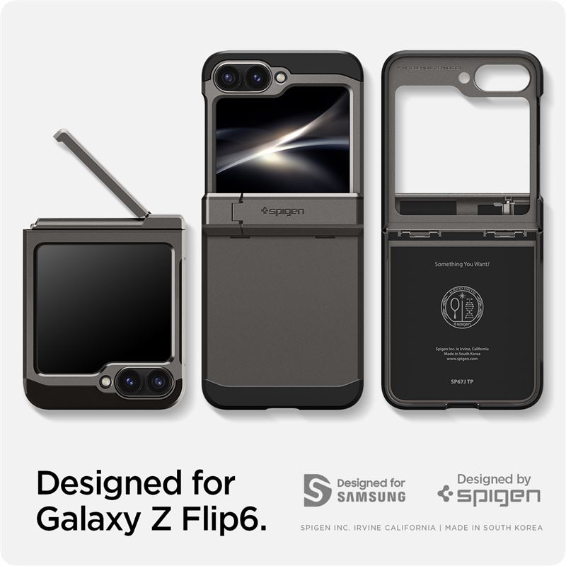 Spigen Tough Armor Pro Case - хибриден кейс с най-висока степен на защита с поставка за Samsung Galaxy Z Flip6 (тъмносив)
