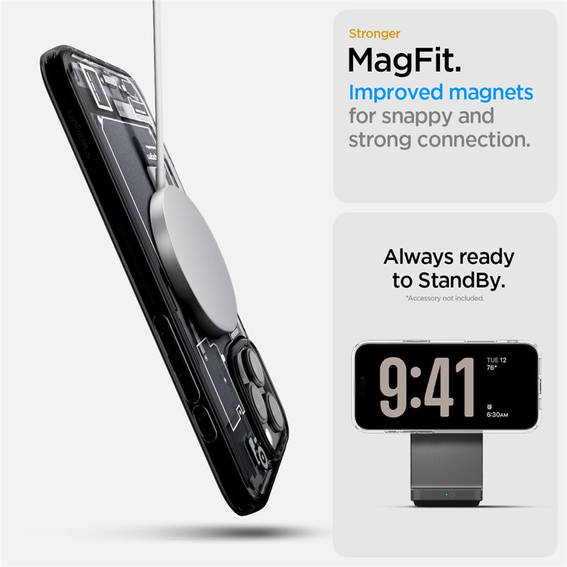 - • Кейсът е снабден с магнит, благодарение на който е съвместим с MagSafe аксесоари. Това е изцяло нов стандарт на Apple за бързо и лесно свързване на аксесоари и безжични зарядни устройства