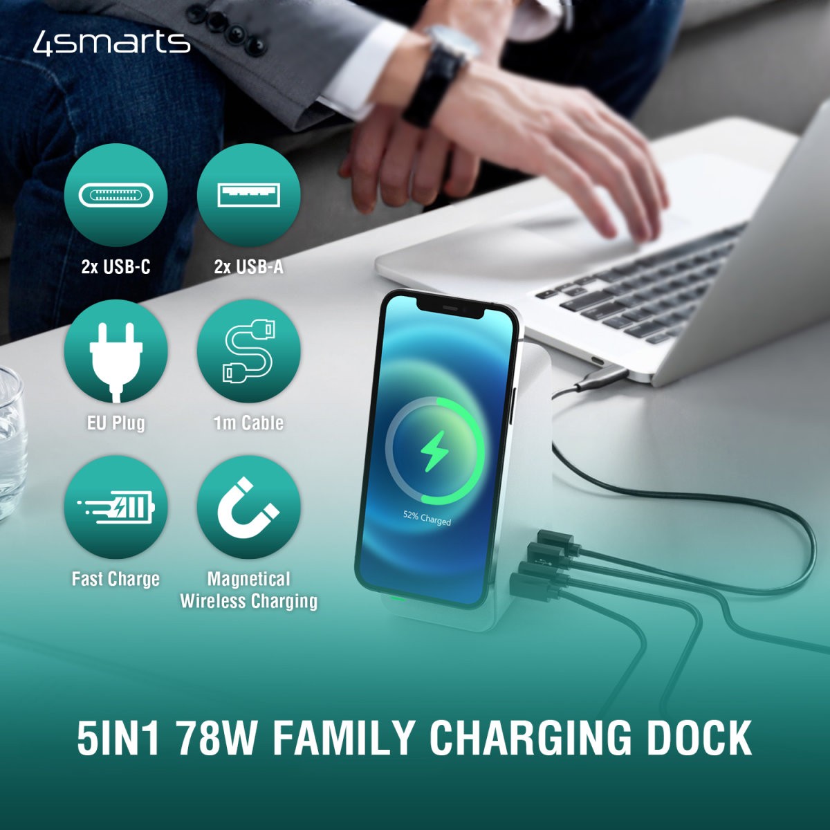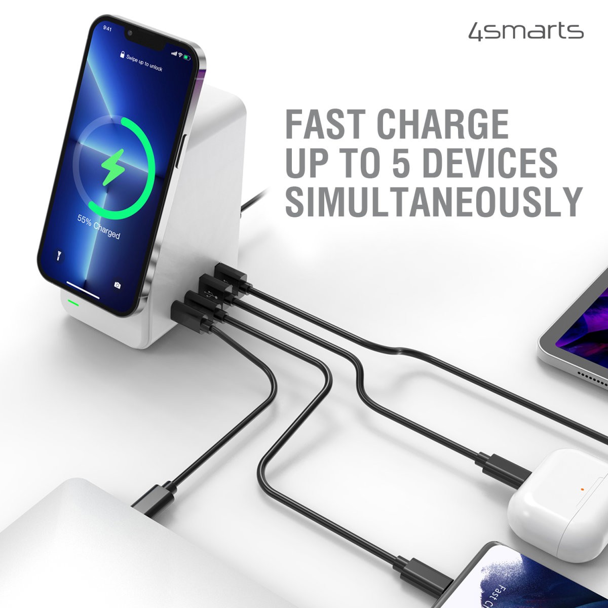 - В комплекта: 1 x 4smarts 5-in-1 Charging Station UltiMag DeskTower; 1 x захранващ кабел за ел. мрежа.