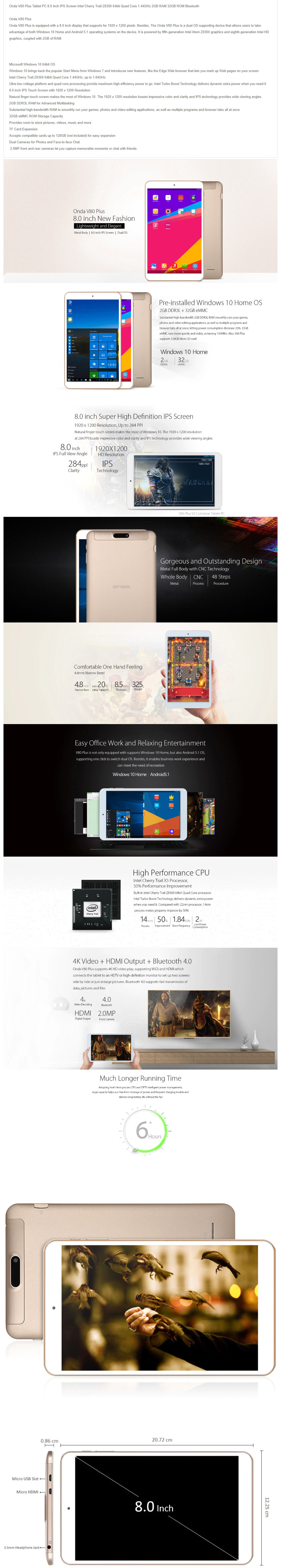 Brand: Onda Type: Tablet PC OS: Windows 10 + Android 5.1 CPU Brand: Intel CPU: Cherry Trail Z8300 Core: 1.44GHz,Quad Core GPU: Intel HD Graphic(Gen8) |
