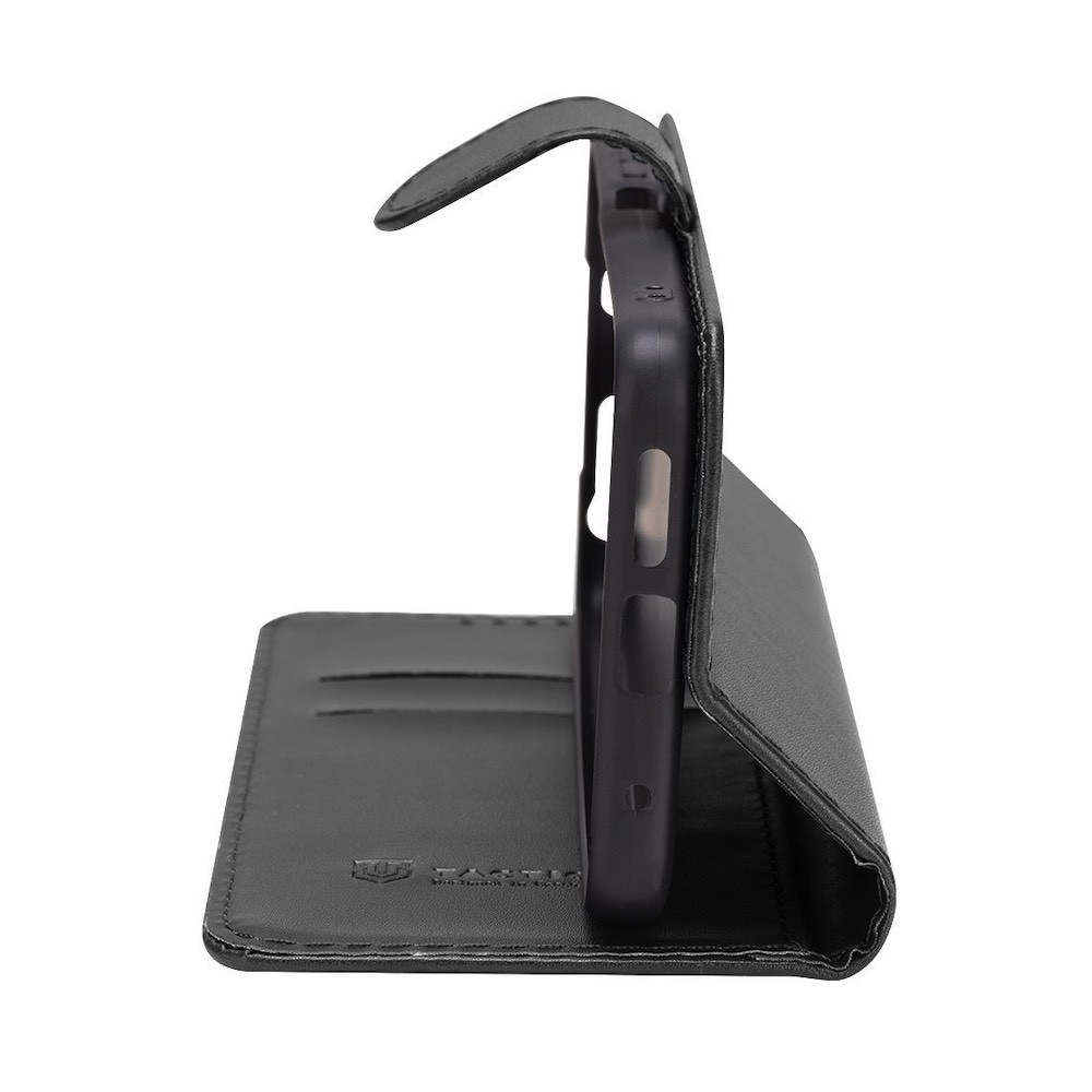 Tactical Field Notes Leather Flip Case - кожен калъф, тип портфейл с поставка и отделение за кр. карти за iPhone 16 (черен)