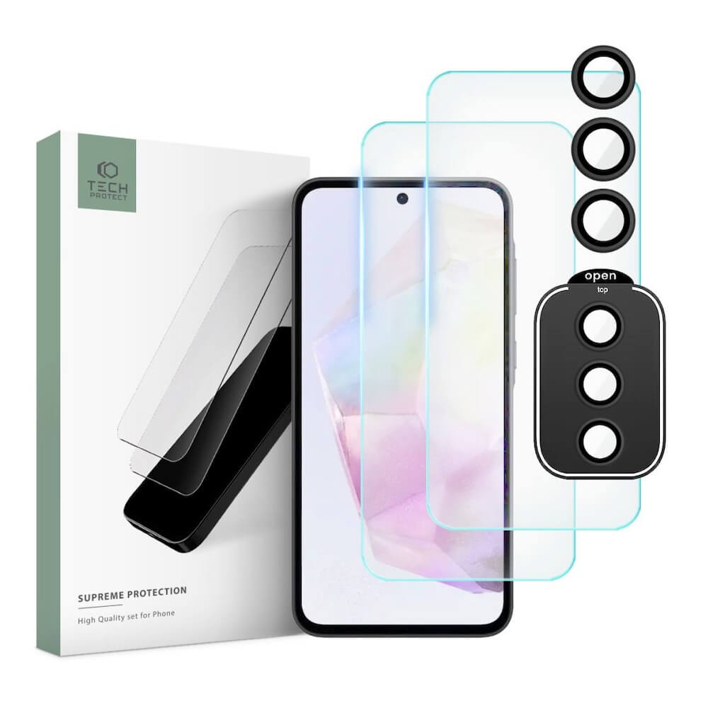 Tech-Protect Supreme Protection Set - комплект 2 броя стъклено защитно покритие за дисплея и стъклено защитно покритие за камерата на Samsung Galaxy A35 5G (прозрачен)