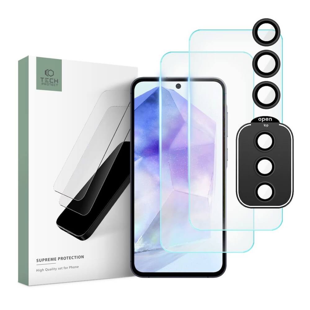 Tech-Protect Supreme Protection Set - комплект 2 броя стъклено защитно покритие за дисплея и стъклено защитно покритие за камерата на Samsung Galaxy A55 5G (прозрачен)