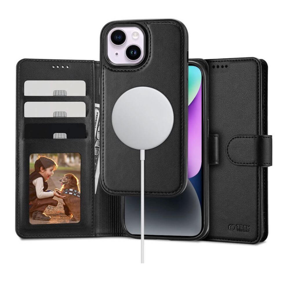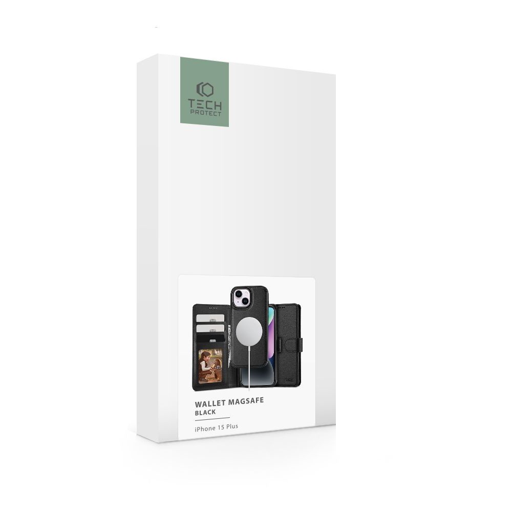 Tech-Protect Wallet Leather MagSafe Flip Case - кожен калъф, тип портфейл с отделящ се кейс с MagSafe за iPhone 15 (черен)