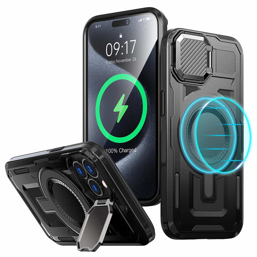 Techsuit CamVault Pro Case - хибриден удароустойчив кейс с вградена поставка и MagSafe за iPhone 15 Pro черен)