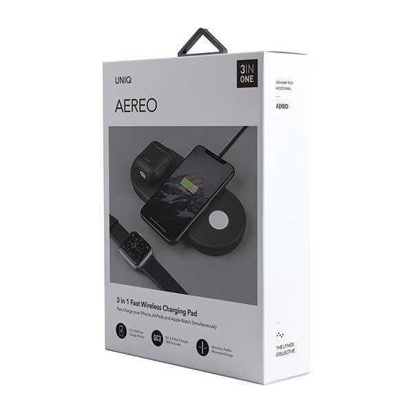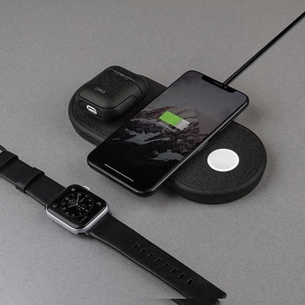 Тройна поставка (пад) за безжично зареждане на Qi съвместими устройства, Apple Watch и Apple Airpods - Uniq Aereo 3in1 Wireless Charging Pad 10W (черен)