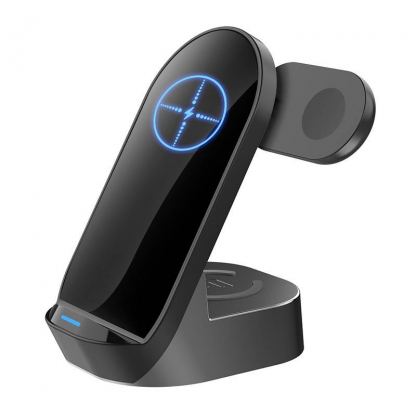 Тройна поставка (пад) за безжично зареждане за iPhone, Apple Watch, AirPods и Qi съвместими мобилни устройства - Budi 3-in-1 Wireless Charger 15W (черен)