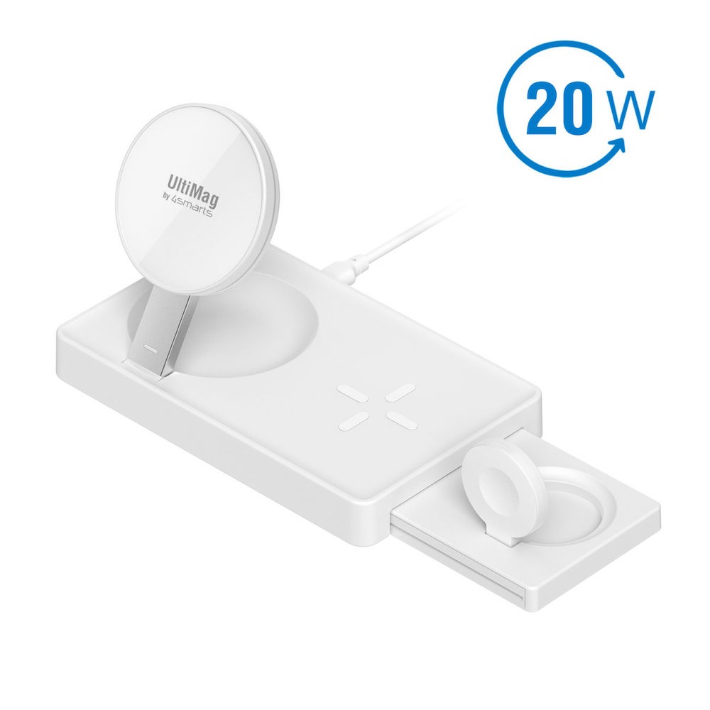 Тройна поставка (пад) за безжично зареждане за iPhone с Magsafe, Apple Watch, AirPods Pro и Qi съвместими мобилни устройства - 4smarts UltiMag Trident 3-in-1 Magnetic Wireless Charger 20W (бял)