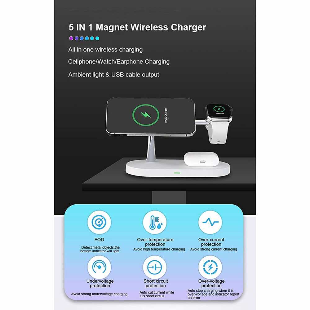 Тройна поставка (пад) за безжично зареждане за iPhone с MagSafe, Apple Watch, AirPods Pro и Qi съвместими мобилни устройства - JC 5-in-1 Wireless Charger (бял)