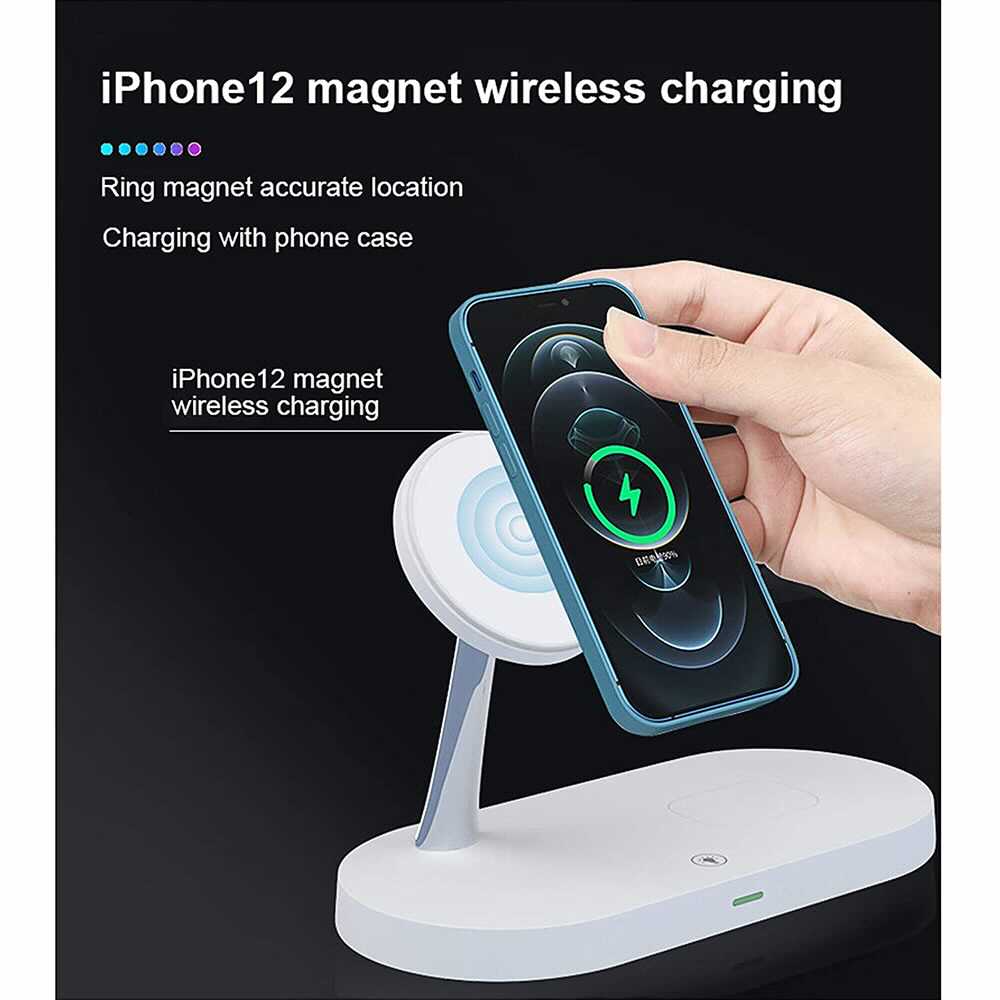 - Тази поставка за безжично зареждане съчетава силата на тройно безжично зареждане с удобството на магнитното свързване. Проектирана за iPhone 13/12-моделите, Apple Watch и AirPods Pro, стойката разполага с вградено магнитно зарядно и безжична поставка за зареждане, за да захранва и трите устройства с лекота.