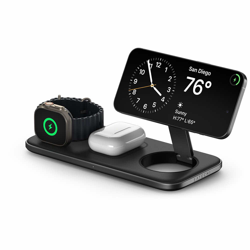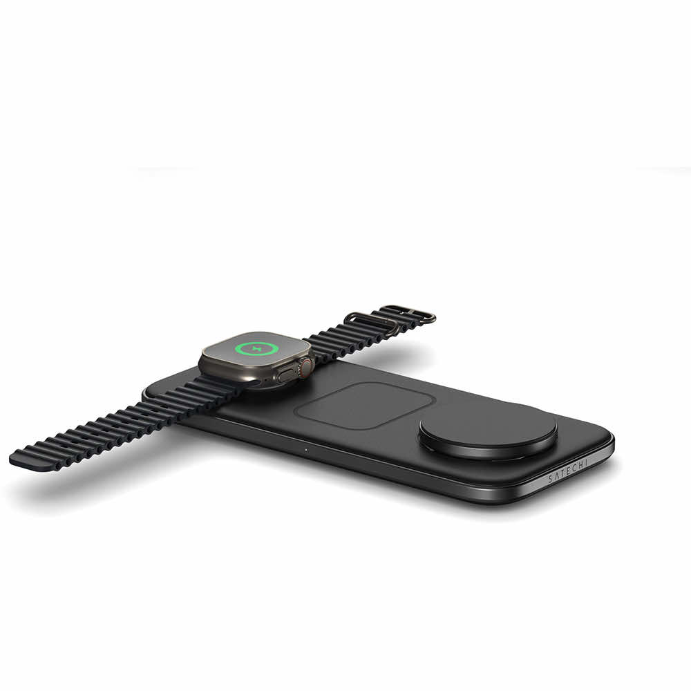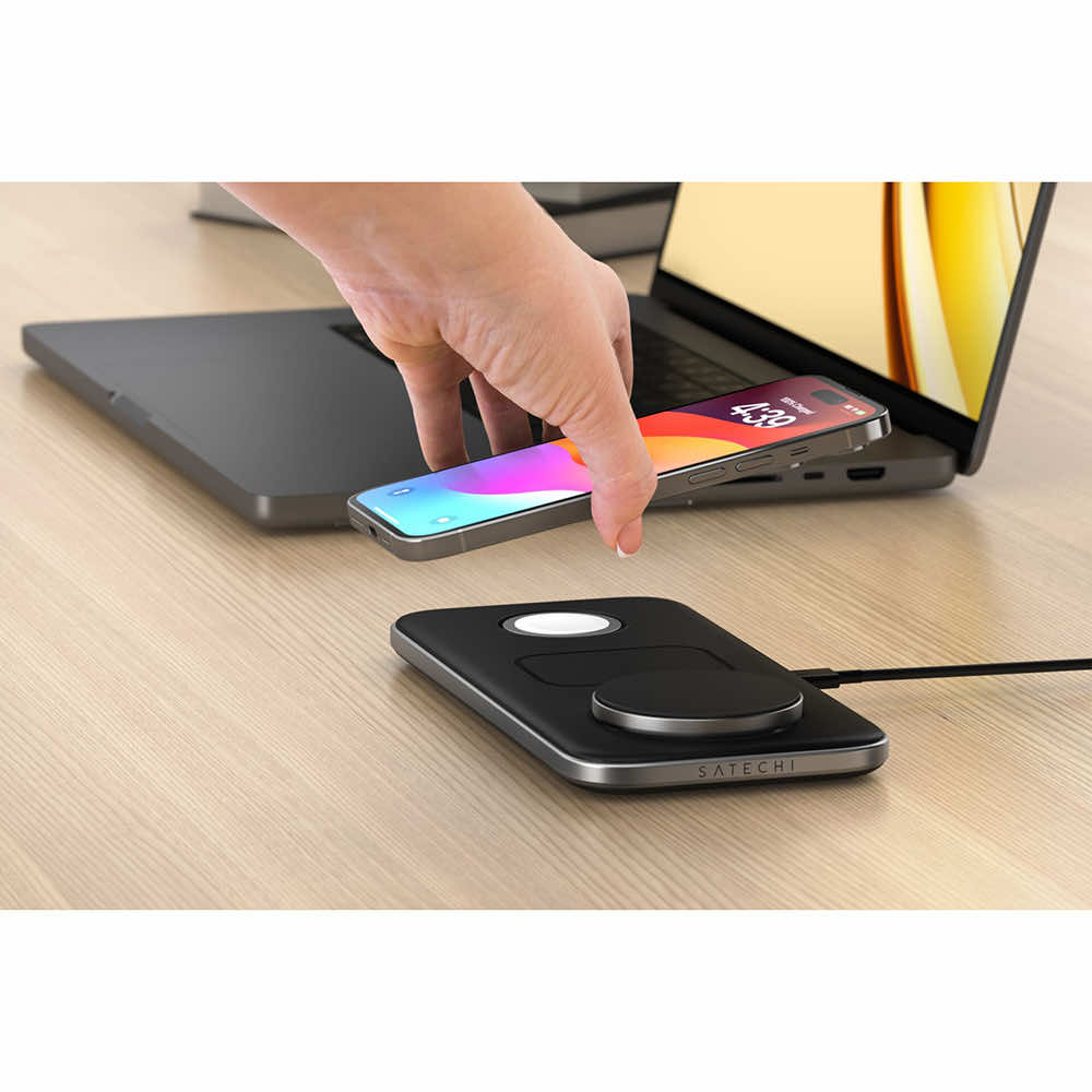 Тройна поставка (пад) за безжично зареждане за iPhone с MagSafe, Apple Watch, AirPods Pro и Qi съвместими мобилни устройства - Satechi Qi2 Trio Wireless Charging Pad (черен)