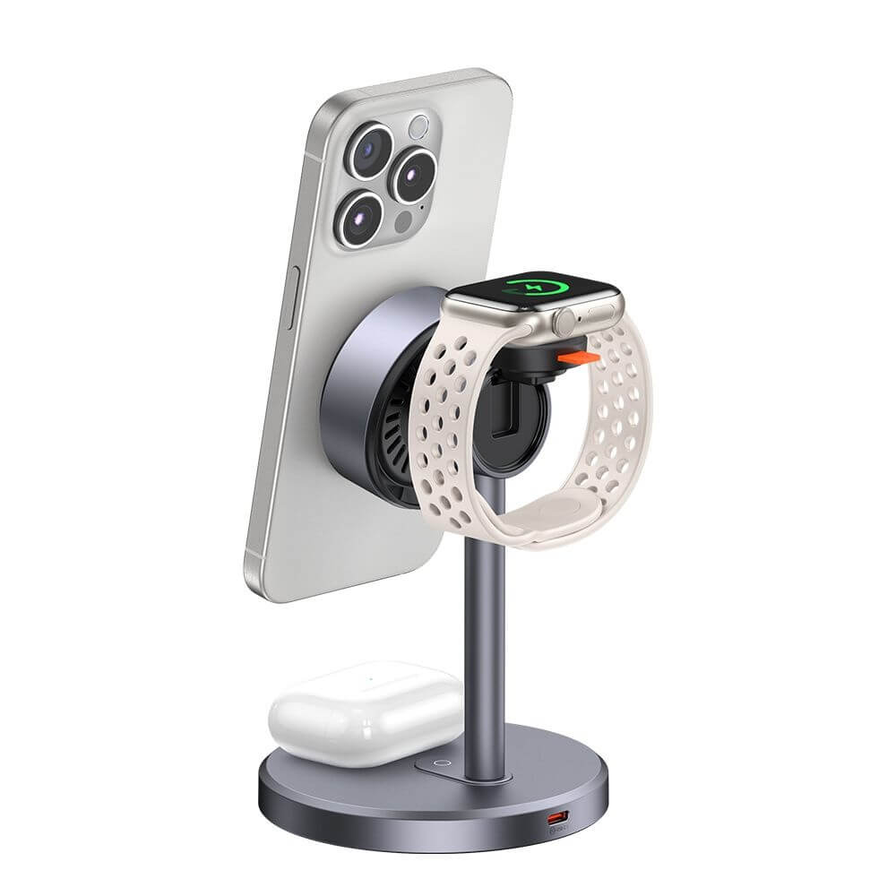 - Многофункционална поставка за зареждане на устройства с MagSafe или Qi2, Apple Watch, AirPods
