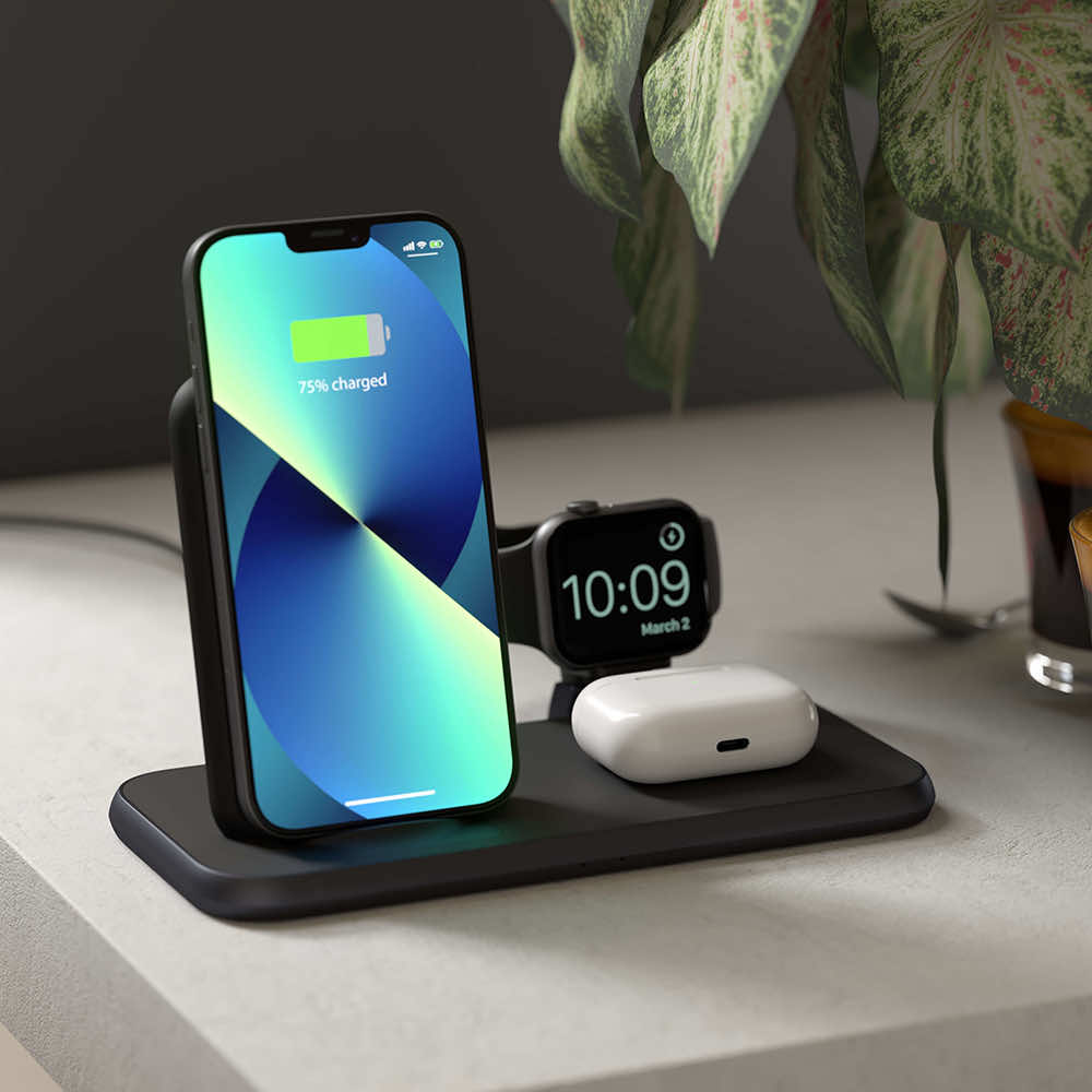 - Изключително практично и компактно устройство - лесно за употреба. Може да зареждате общо четири устройства едновременно: два смартфона безжично, Apple Watch и още едно устройство, благодарени на допълнителния USB порт.