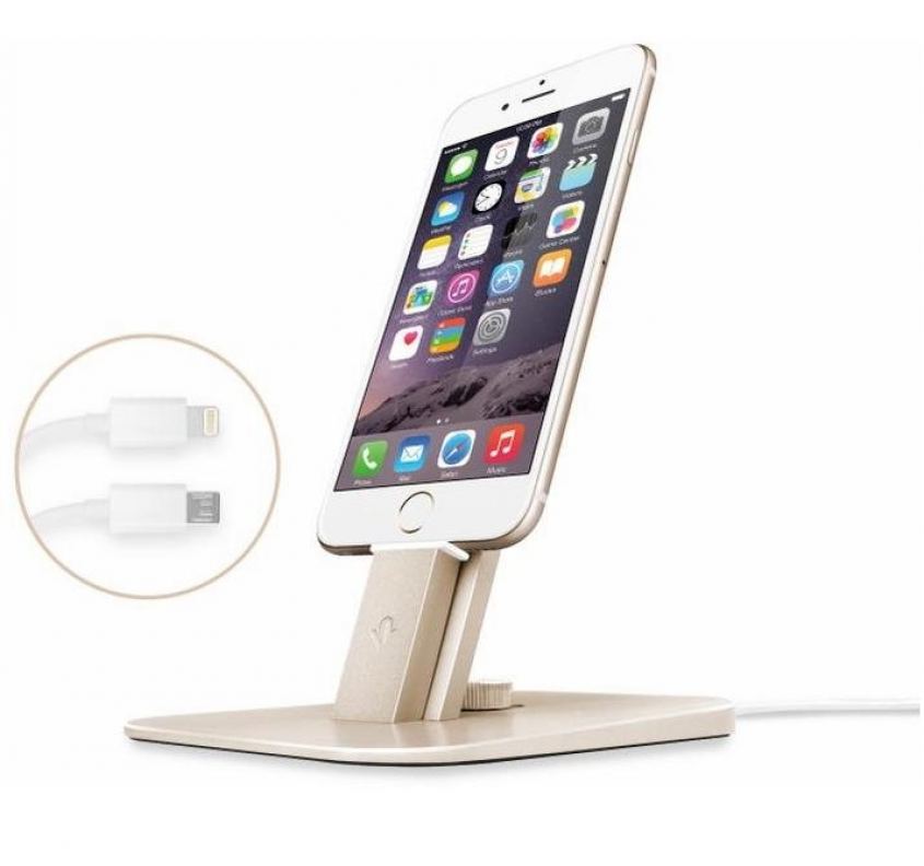 TwelveSouth HiRise Deluxe - алуминиева повдигаща поставка с Lightning и MicroUSB кабели за iPhone и iPad (златист)