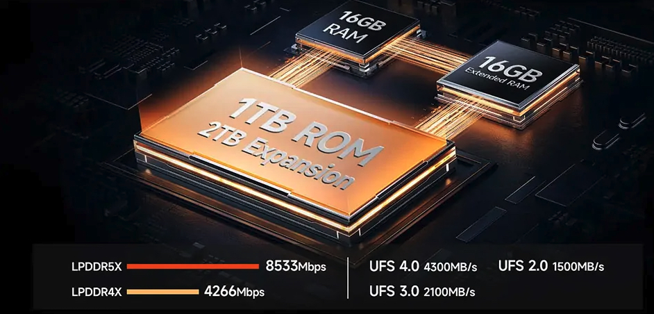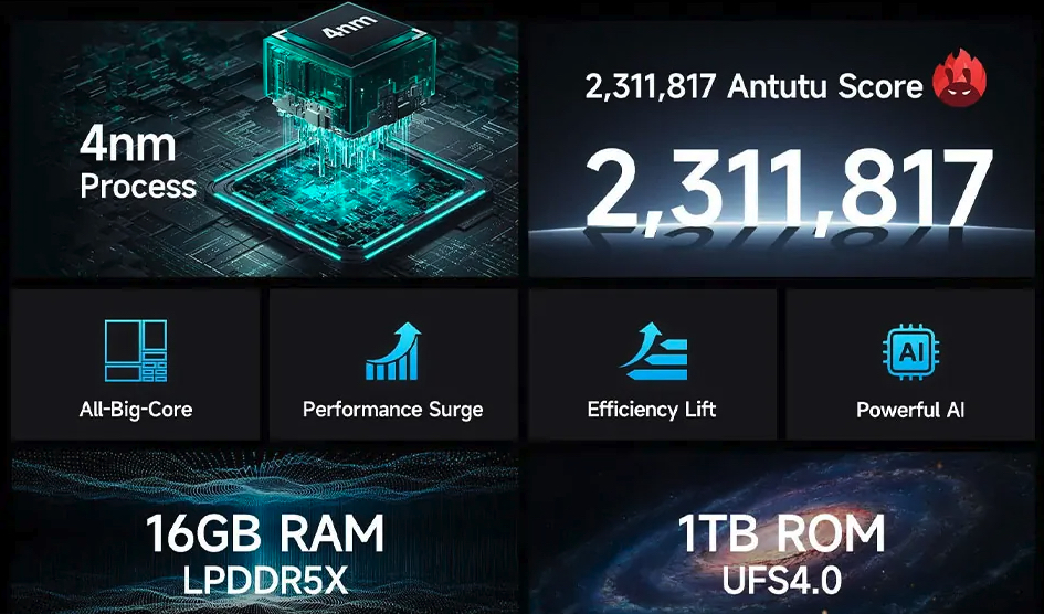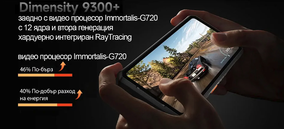 Сърцето на устройството е MediaTek Dimensity 9300+, осемядрен процесор от последно поколение, осигуряващ изключителна бързина и ефективност (по-бърз от Galaxy S25 Ultra) , подпомогнат от до 32GB RAM и 1TB вградена памет с възможност за разширение чрез microSDXC карта.