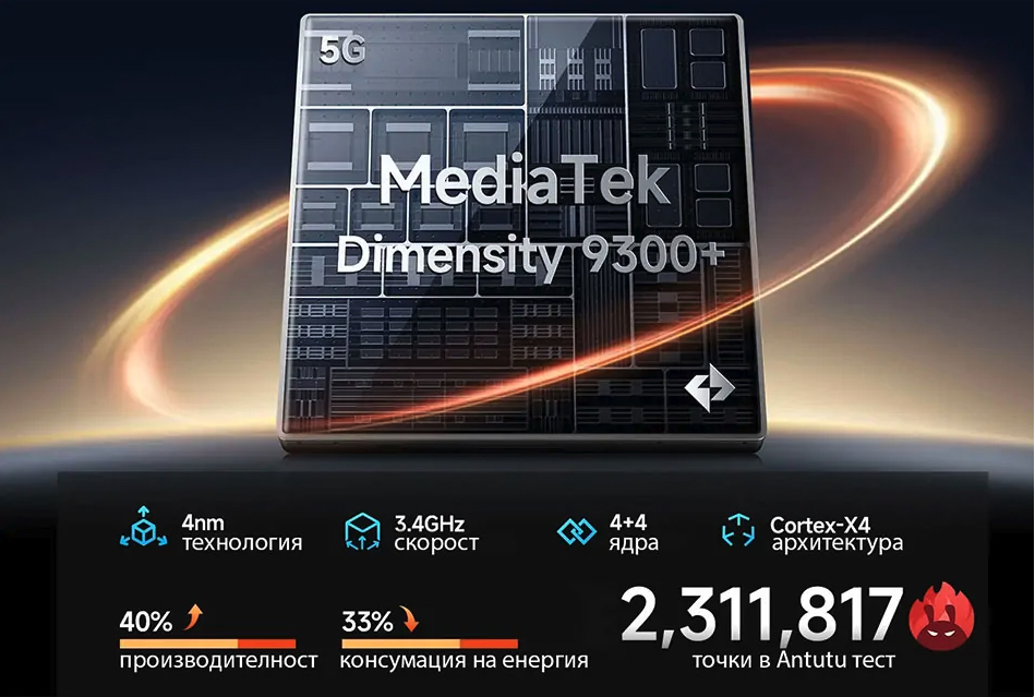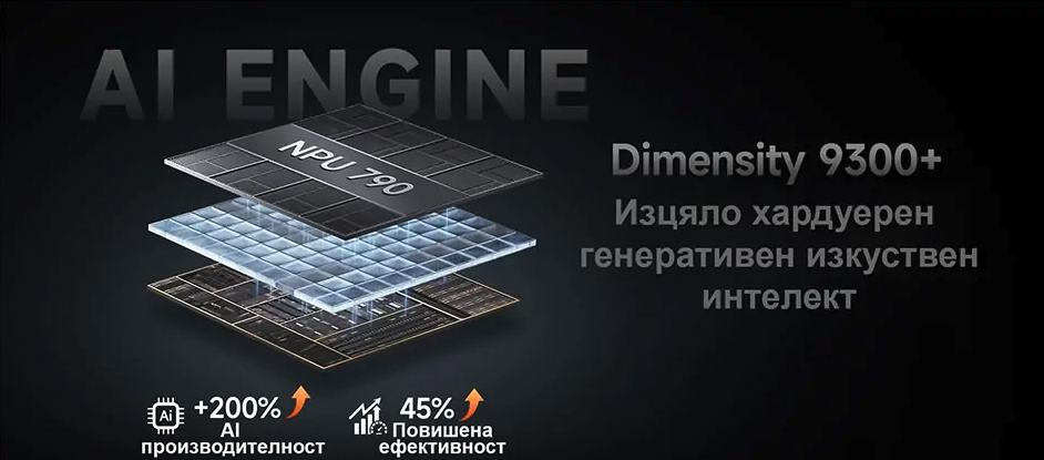 Процесор: MediaTek Dimensity 9300+ (по-бърз от новия Galaxy S25 Ultra) - Octa-core (1x 3.4 GHz Cortex-X4 & 3x 2.85 GHz Cortex-X4 & 4x 2.0 GHz Cortex-A720)