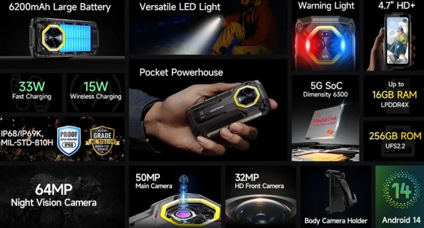 Ulefone Armor Mini 20 Pro е оборудван с осемядрен процесор MediaTek Dimensity 6300, който гарантира бърза работа дори при по-тежки приложения и игри. Благодарение на 16GB RAM (8GB физическа и 8GB виртуална памет), телефонът осигурява гладка и бърза работа. Вградената памет от 256GB може да се разшири до 2TB с microSD карта, което ви дава достатъчно място за съхранение на снимки, видеа и документи.