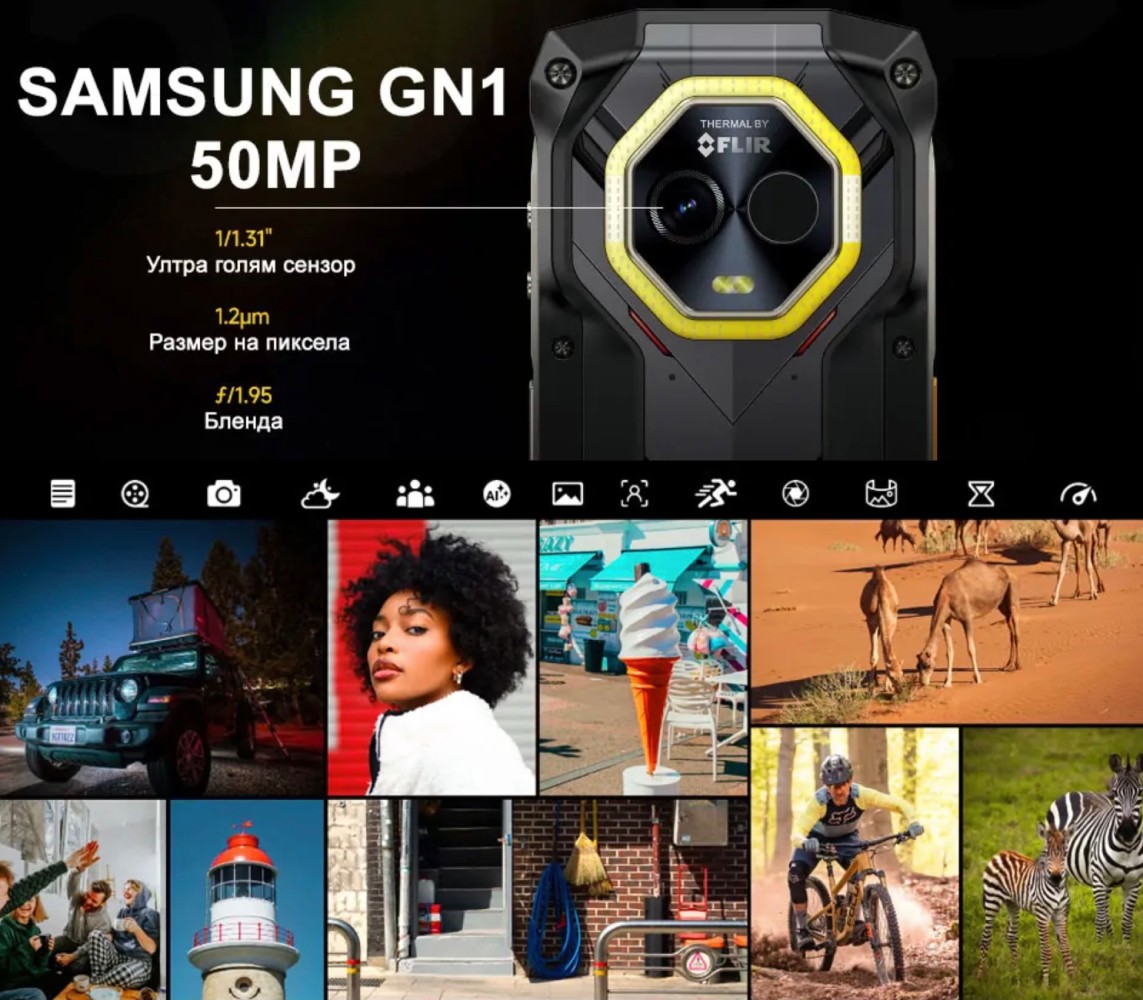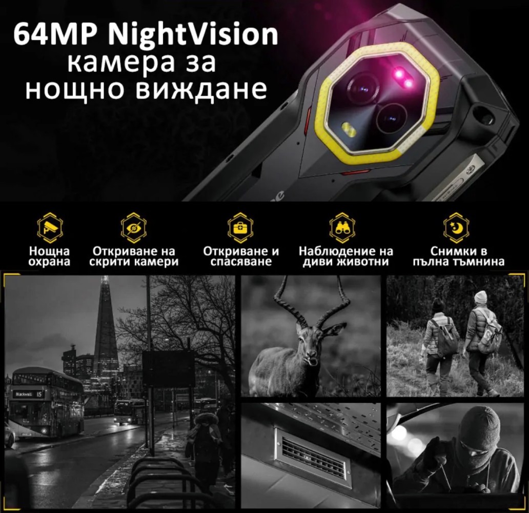 Една от най-забележителните характеристики на Armor Mini 20 Pro е камерата за нощно виждане. С 64MP сензор и инфрачервени LED светодиоди, този телефон ви позволява да правите качествени снимки дори в пълен мрак. Нощната камера е особено полезна за нощна охрана, наблюдение на диви животни или дори за арт фотография. Основната камера от 50MP, снабдена със сензор от Samsung, осигурява отлични снимки, дори при ниска осветеност, благодарение на изкуствения интелект и двойната LED светкавица.