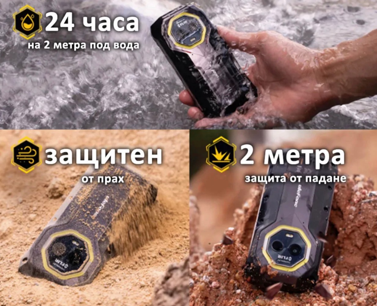 Защита: IP68 сертифициран – прахо и водоустойчив (до 2 метра за 30 минути), MIL-STD 810H