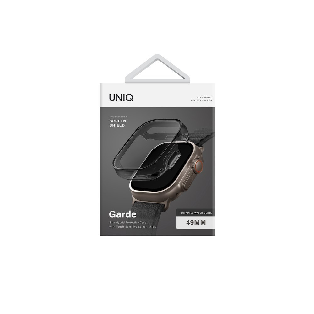 Uniq Garde Hybrid Apple Watch Case - качествен силиконов (TPU) кейс с вграден протектор за дисплея на Apple Watch Ultra 49мм (черен-прозрачен)