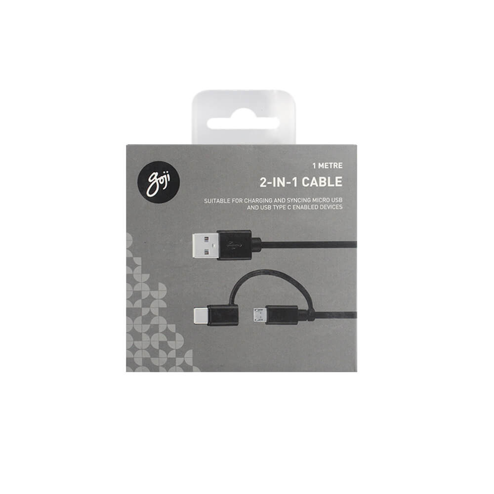 Представяме ви Goji 2-в-1 кабел за зареждане и синхронизиране на мобилни устройства, който е идеален за вашите нужди. С комбинация от microUSB и USB-C конектори, той предлага универсално решение за зареждане и пренос на данни.