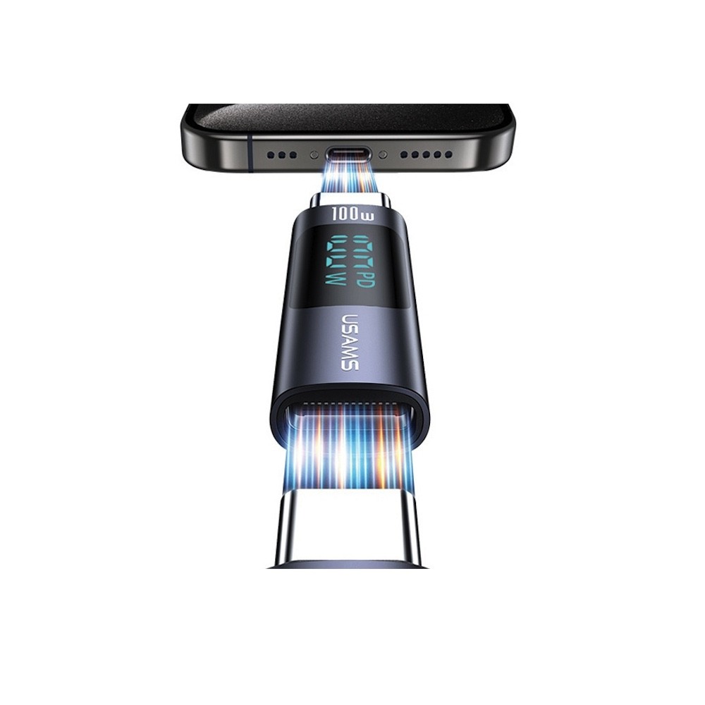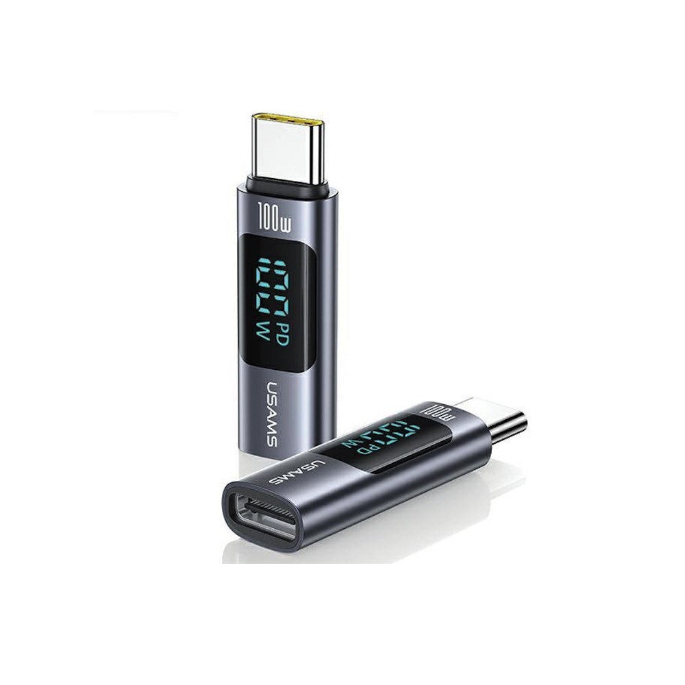 Usams Digital Display USB-C to USB-C Adapter 100W - адаптер от USB-C женско към USB-C мъжко с дисплей за мобилни устройства с USB-C порт (тъмносив)