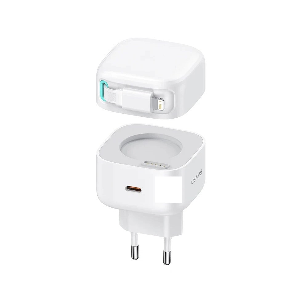 Usams GaN Wall Charger With Magnetic Retractable Lightning Cable 35W - захранване за ел. мрежа с 1xUSB-C изход и вграден Lightning кабел (бял)