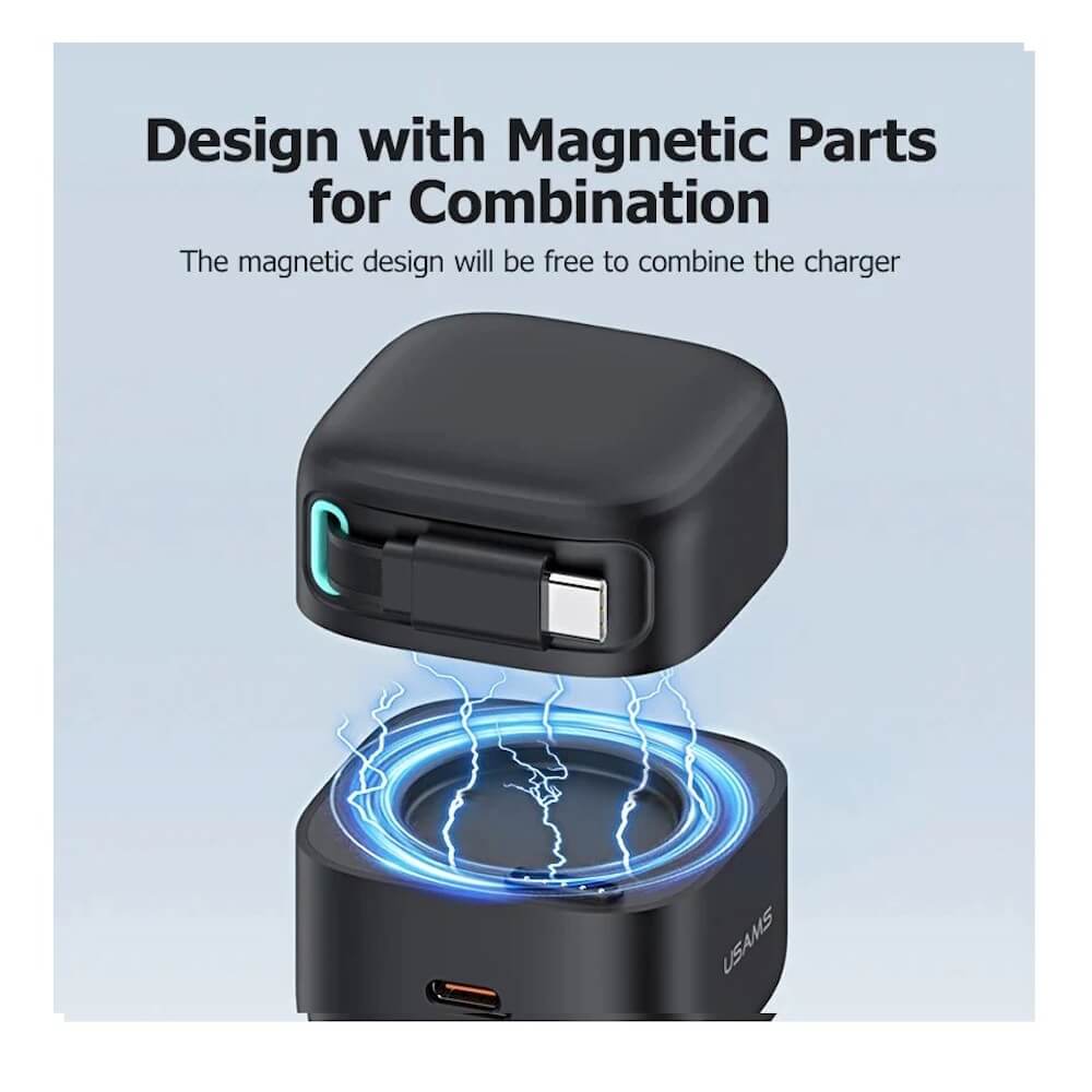 Usams GaN Wall Charger With Magnetic Retractable USB-C Cable 35W - захранване за ел. мрежа с USB-C порт и вграден USB-C кабел (черен)