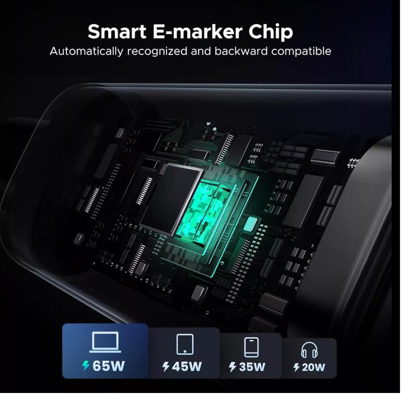 Безопасност и производителност на най-високо ниво. Кабелът Ugreen Uno е оборудван с усъвършенстван E-Marker чип, който автоматично настройва параметрите на зареждане към свързаното устройство. Това решение гарантира безопасност по време на зареждане, като ефективно предотвратява пренапрежения и претоварвания. В резултат на това не само защитавате устройствата си, но и удължавате живота на батериите им.