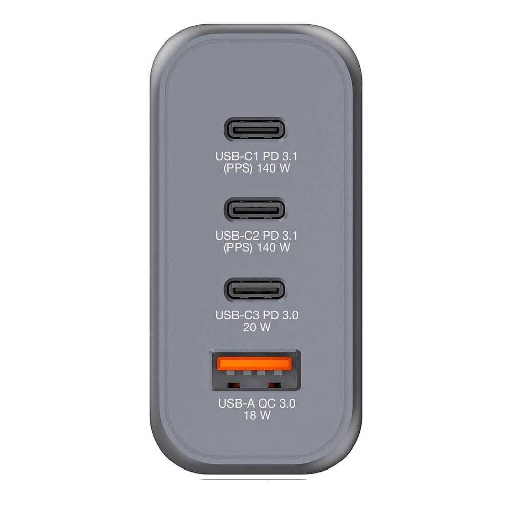 Verbatim GaN Fast Wall Charger 140W - захранване за ел. мрежа за мобилни устройства с 1xUSB-A и 3xUSB-C изходи с технология за бързо зареждане и преходници за цял свят (тъмносив)