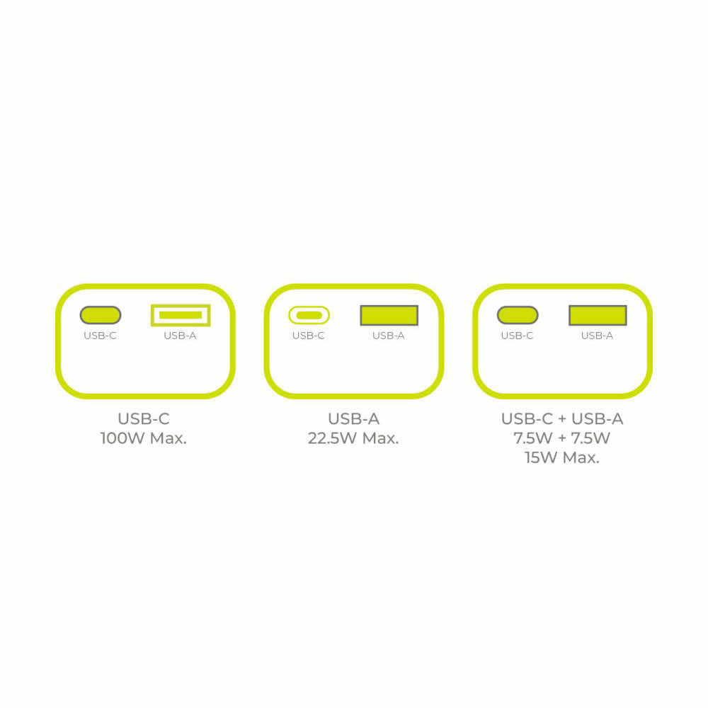 - Външна батерия, оборудвана с USB-A и USB-C порта за бързо зареждане на вашите мобилни устройства. Това осигурява бързо и удобно зареждане.