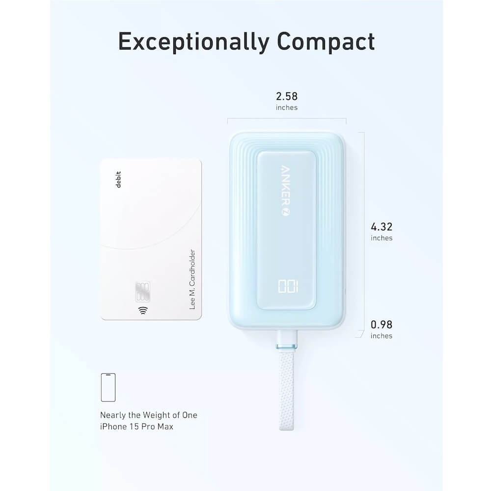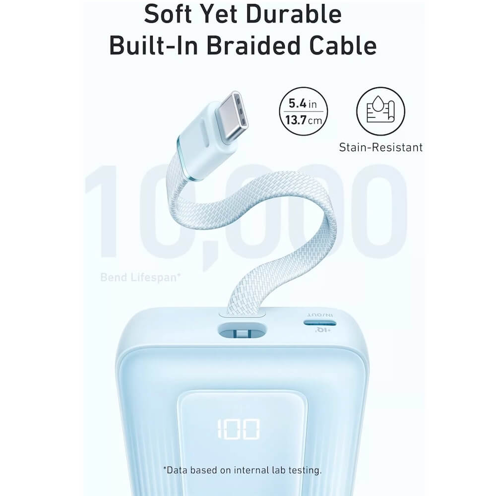 Външна батерия с вграден USB-C кабел, USB-C и USB-A портове и технология за бързо зареждане - Anker Zolo Power Bank 30W 10000 mAh (светлосин)