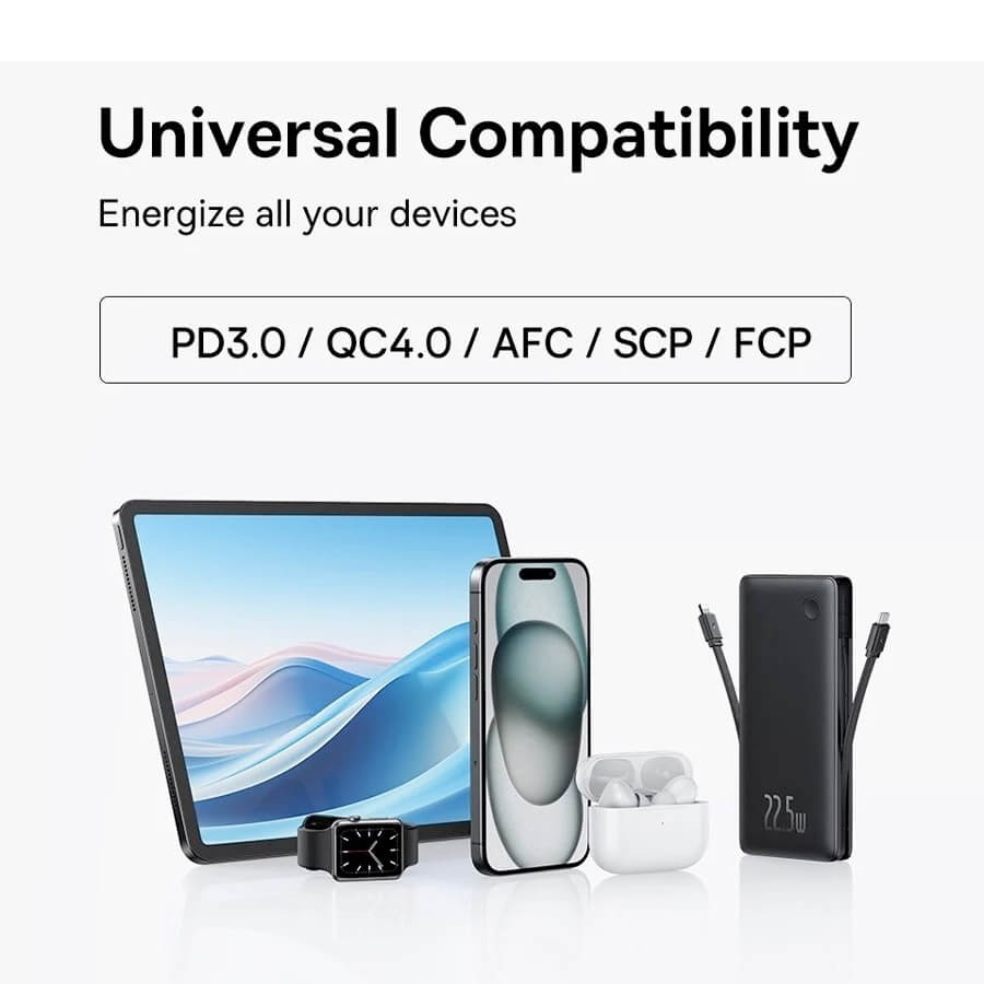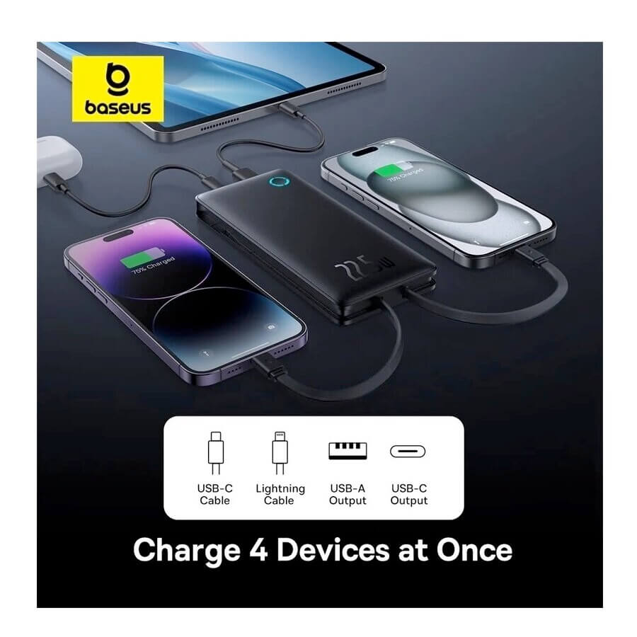 С Baseus Airpow Lite можете да зареждате до четири устройства едновременно, благодарение на двата отделни порта и вградения USB-C и Lightning кабел. LED индикацията ви информира за оставащото ниво на батерията, а смарт чипът автоматично разпознава вашите устройства, осигурявайки необходимата мощност.