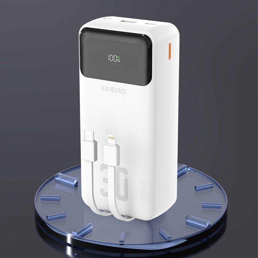 Външна батерия с вградени USB-C и Lightning кабели и USB-C, USB-A портове и технология за бързо зареждане - Dudao K15MAX Power Bank With Build-in Cables 22.5W 30000 mAh (бял)