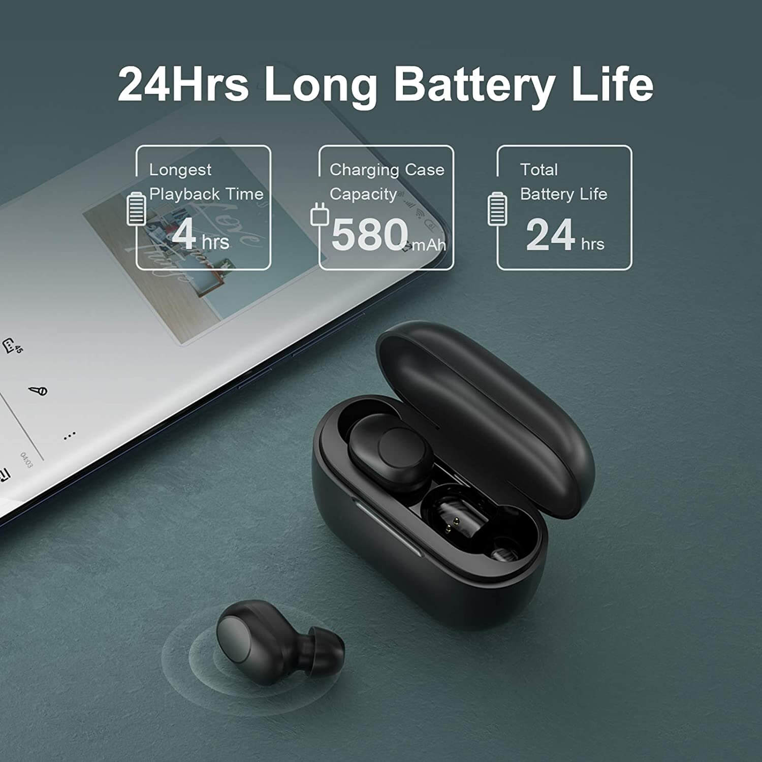 - 24 часа живот на батерията - След като GT5 са напълно заредени, можете да слушате музика до 4 часа. Използвайки кейса за зареждане с мощност от 580 mAh, общият живот на батерията е до 24 часа