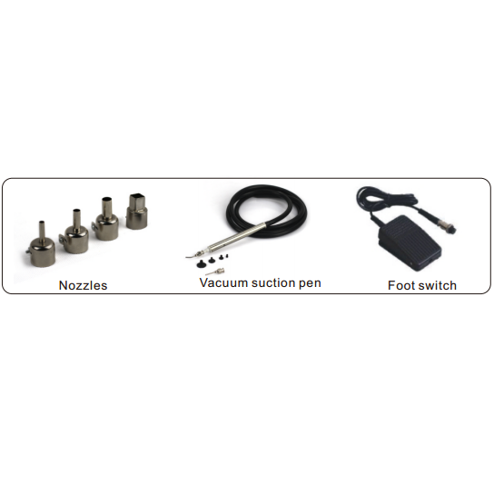 - Напрежение: AC 220V-240V, 50-60Hz - Мощност: 1300W - Работна температура: 100℃~500℃ - Въздушен обем: 6~200 - Въздушен поток: 200L/min(MAX) - Температурен диапазон за работа: 0~40℃ - Влажност за съхранение: 35%-45%
