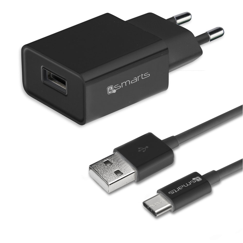 Захранване за ел. мрежа 2.4A с USB изход и USB-C кабел - 4smarts Basic Wall Charger Set 2.4A 12W (черен)